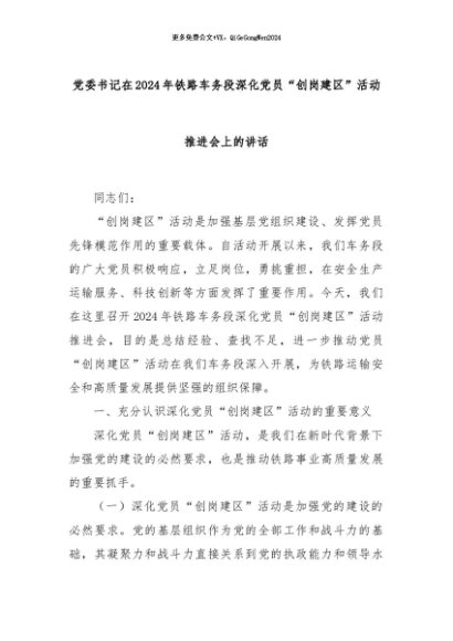 【七哥公文】2024年:党委书记在2024年铁路车务段深化党员“创岗建区”活动推进会上的讲话+更多免费公文+VX:QiGeGongWen2024