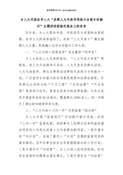 【七哥公文】2024年:乡人大代表在市人大“发挥人大代表作用助力全面乡村振兴”主题活动经验交流会上的发言+更多免费公文+VX:QiGeGongWen2024