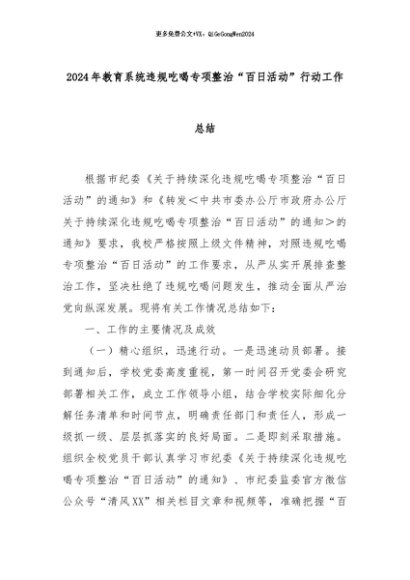【七哥公文】2024年:2024年教育系统违规吃喝专项整治“百日活动”行动工作总结+更多免费公文+VX:QiGeGongWen2024