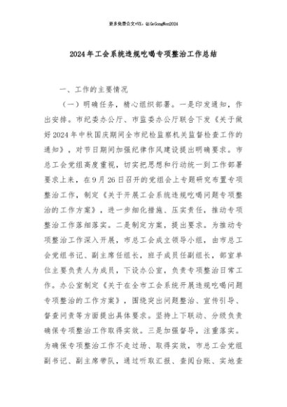 / 【七哥公文】2024年:2024年工会系统违规吃喝专项整治工作总结+更多免费公文+VX:QiGeGongWen2024