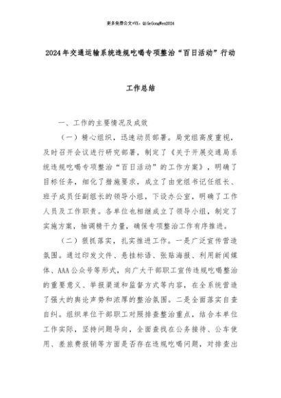 【七哥公文】2024年:2024年交通运输系统违规吃喝专项整治“百日活动”行动工作总结+更多免费公文+VX:QiGeGongWen2024
