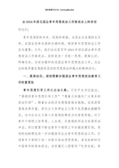 【七哥公文】2024年:在2024年深化国企青年思想政治工作推进会上的讲话+更多免费公文+VX:QiGeGongWen2024