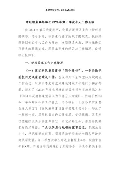 / 【七哥公文】2024年:市纪检监察部部长2024年第三季度个人工作总结+更多免费公文+VX:QiGeGongWen2024