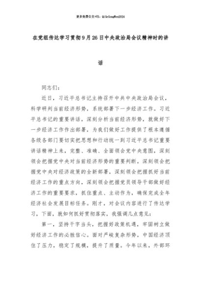 【七哥公文】2024年:在党组传达学习贯彻9月26日中央政治局会议精神时的讲话+更多免费公文+VX:QiGeGongWen2024