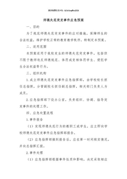 / 【七哥公文】2024年:师德失范突发事件应急预案+更多免费公文+VX:QiGeGongWen2024