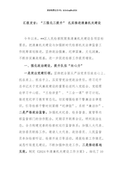 / 【七哥公文】2024年:汇报发言:“三强化三提升” 扎实推进清廉机关建设+更多免费公文+VX:QiGeGongWen2024