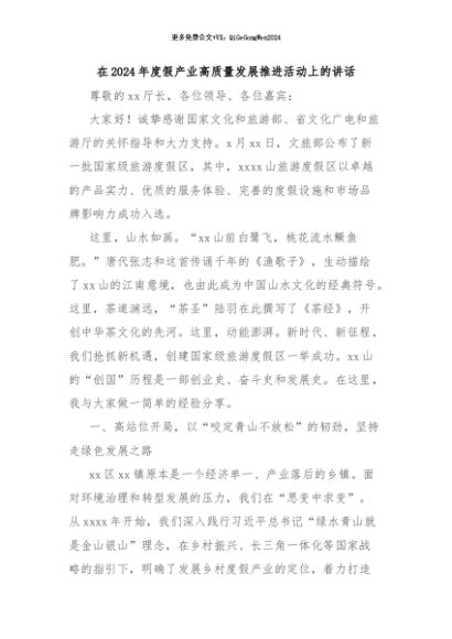 / 【七哥公文】2024年:在2024年度假产业高质量发展推进活动上的讲话+更多免费公文+VX:QiGeGongWen2024