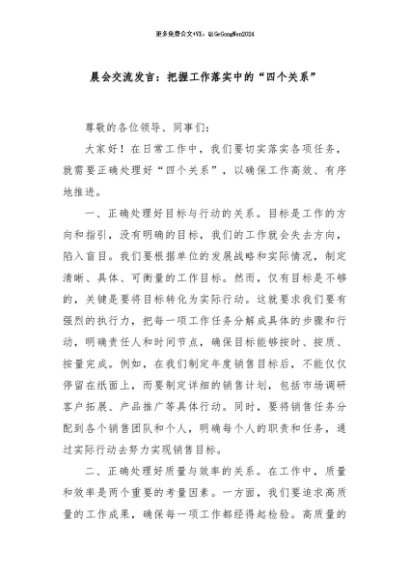 / 【七哥公文】2024年:晨会交流发言:把握工作落实中的“四个关系”+更多免费公文+VX:QiGeGongWen2024