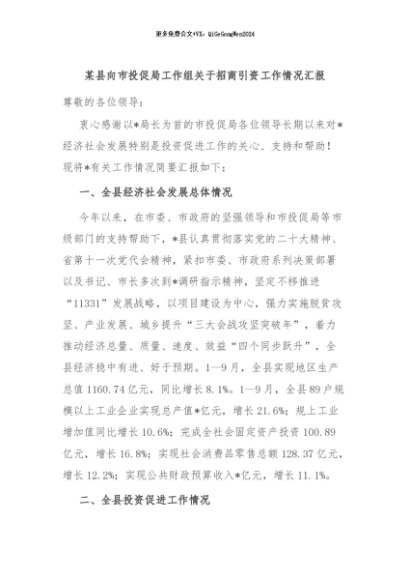 / 【七哥公文】2024年:某县向市投促局工作组关于招商引资工作情况汇报+更多免费公文+VX:QiGeGongWen2024