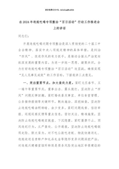 【七哥公文】2024年:在2024年违规吃喝专项整治“百日活动”行动工作推进会上的讲话+更多免费公文+VX:QiGeGongWen2024
