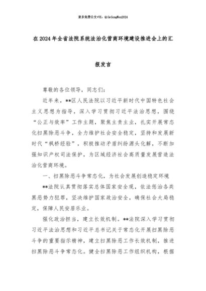 【七哥公文】2024年:在2024年全省法院系统法治化营商环境建设推进会上的汇报发言+更多免费公文+VX:QiGeGongWen2024