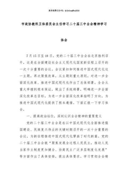 【七哥公文】2024年:市政协教科卫体委员会主任学习二十届三中全会精神学习体会+更多免费公文+VX:QiGeGongWen2024