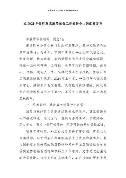 【七哥公文】2024年:在2024年银行系统基层减负工作推进会上的汇报发言+更多免费公文+VX:QiGeGongWen2024