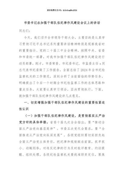 / 【七哥公文】2024年:市委书记在加强干部队伍纪律作风建设会议上的讲话+更多免费公文+VX:QiGeGongWen2024