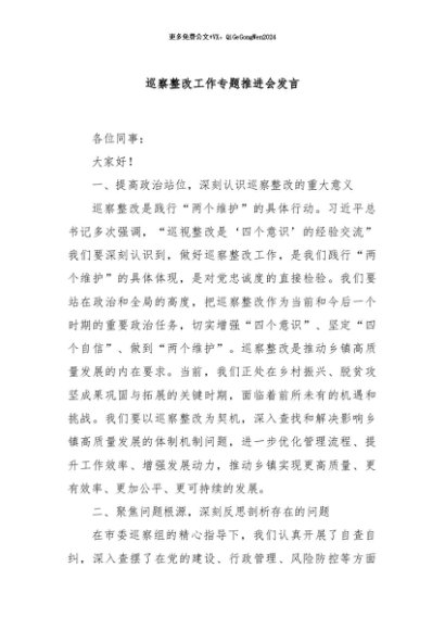 / 【七哥公文】2024年:巡察整改工作专题推进会发言+更多免费公文+VX:QiGeGongWen2024