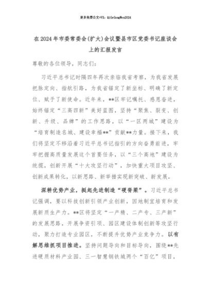 【七哥公文】2024年:在2024年市委常委会(扩大)会议暨县市区党委书记座谈会上的汇报发言+更多免费公文+VX:QiGeGongWen2024