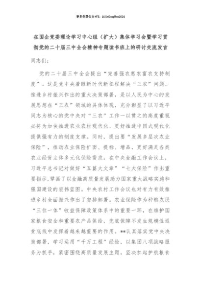 【七哥公文】2024年:在国企党委理论学习中心组(扩大)集体学习会暨学习贯彻党的二十届三中全会精神专题读书班上的研讨交流发言+更多免费公文+VX:QiGeGongWen2024