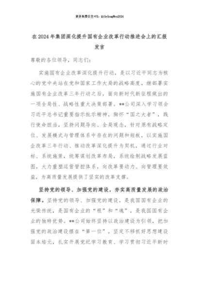 【七哥公文】2024年:在2024年集团深化提升国有企业改革行动推进会上的汇报发言+更多免费公文+VX:QiGeGongWen2024