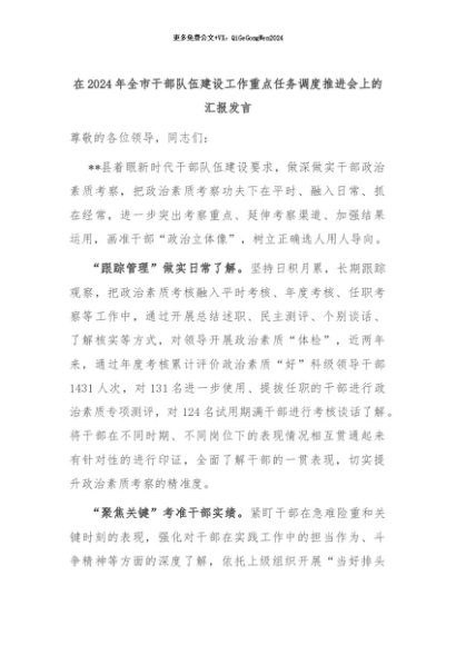 【七哥公文】2024年:在2024年全市干部队伍建设工作重点任务调度推进会上的汇报发言+更多免费公文+VX:QiGeGongWen2024