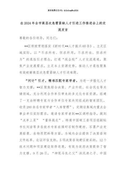 【七哥公文】2024年:在2024年全市高层次急需紧缺人才引进工作推进会上的交流发言+更多免费公文+VX:QiGeGongWen2024