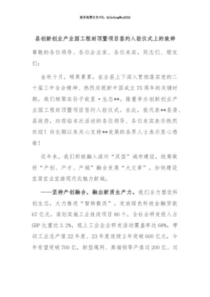 【七哥公文】2024年:县创新创业产业园工程封顶暨项目签约入驻仪式上的致辞+更多免费公文+VX:QiGeGongWen2024