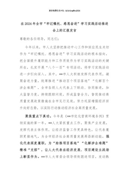 【七哥公文】2024年:在2024年全市“牢记嘱托、感恩奋进”学习实践活动推进会上的汇报发言+更多免费公文+VX:QiGeGongWen2024