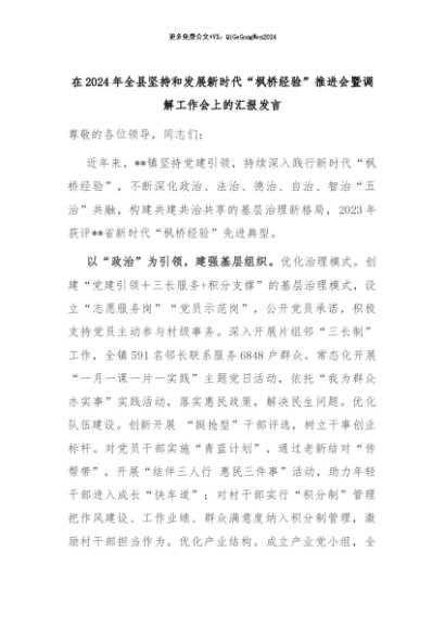 【七哥公文】2024年:在2024年全县坚持和发展新时代“枫桥经验”推进会暨调解工作会上的汇报发言+更多免费公文+VX:QiGeGongWen2024
