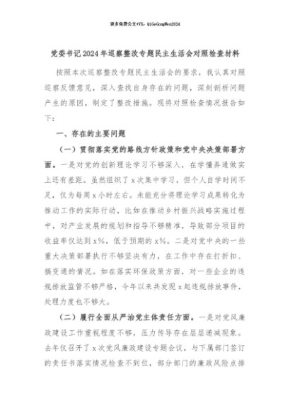 【七哥公文】2024年:党委书记2024年巡察整改专题民主生活会对照检查材料+更多免费公文+VX:QiGeGongWen2024