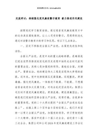 【七哥公文】2024年:交流研讨:持续强化党风廉政警示教育 着力推进作风建设+更多免费公文+VX:QiGeGongWen2024