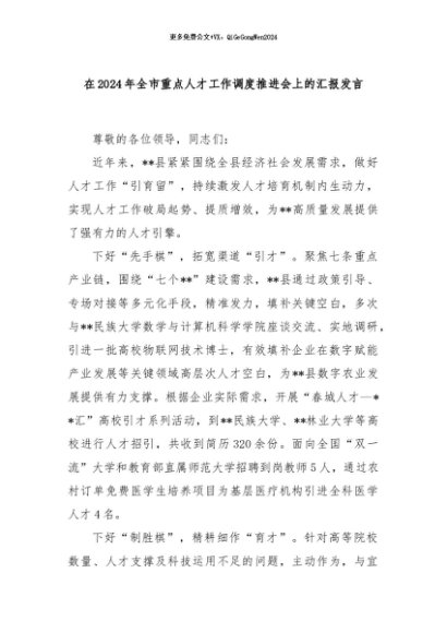 【七哥公文】2024年:在2024年全市重点人才工作调度推进会上的汇报发言+更多免费公文+VX:QiGeGongWen2024