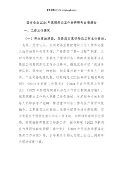 / 【七哥公文】2024年:国有企业2024年意识形态工作分析研判自查报告+更多免费公文+VX:QiGeGongWen2024