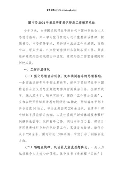 / 【七哥公文】2024年:团市委2024年第三季度意识形态工作情况总结+更多免费公文+VX:QiGeGongWen2024