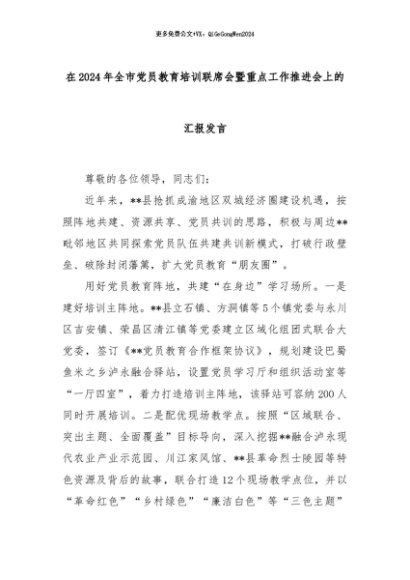 【七哥公文】2024年:在2024年全市党员教育培训联席会暨重点工作推进会上的汇报发言+更多免费公文+VX:QiGeGongWen2024