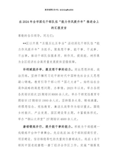 【七哥公文】2024年:在2024年全市深化干部队伍“能力作风提升年”推进会上的汇报发言+更多免费公文+VX:QiGeGongWen2024