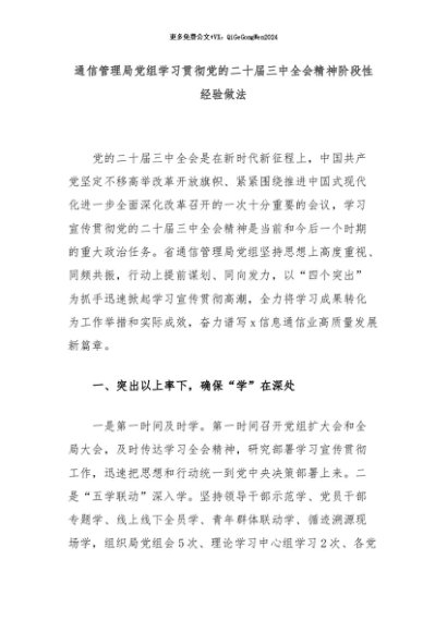 【七哥公文】2024年:通信管理局党组学习贯彻党的二十届三中全会精神阶段性经验做法+更多免费公文+VX:QiGeGongWen2024