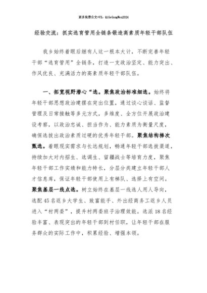 【七哥公文】2024年:经验交流:抓实选育管用全链条锻造高素质年轻干部队伍+更多免费公文+VX:QiGeGongWen2024