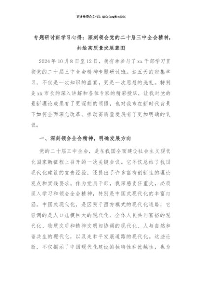 【七哥公文】2024年:专题研讨班学习心得:深刻领会党的二十届三中全会精神,共绘高质量发展蓝图+更多免费公文+VX:QiGeGongWen2024