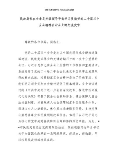 【七哥公文】2024年:民政局长在全市县处级领导干部学习贯彻党的二十届三中全会精神研讨会上的交流发言+更多免费公文+VX:QiGeGongWen2024