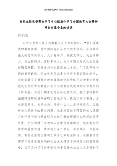【七哥公文】2024年:校长在校党委理论学习中心组集体学习全国教育大会精神研讨交流会上的讲话+更多免费公文+VX:QiGeGongWen2024