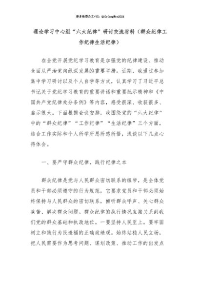 【七哥公文】2024年:理论学习中心组“六大纪律”研讨交流材料(群众纪律工作纪律生活纪律)+更多免费公文+VX:QiGeGongWen2024