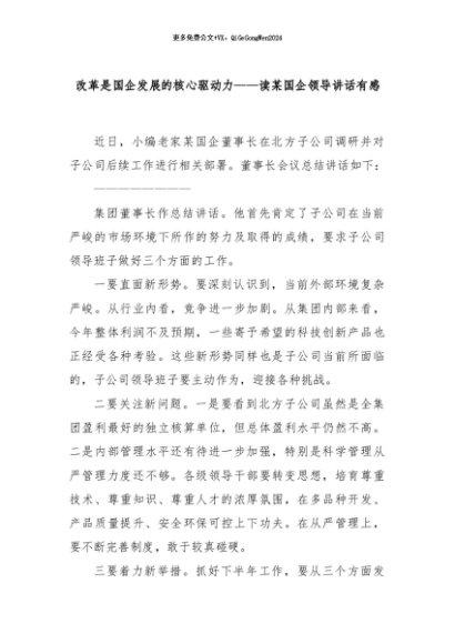 【七哥公文】2024年:改革是国企发展的核心驱动力——读某国企领导讲话有感+更多免费公文+VX:QiGeGongWen2024