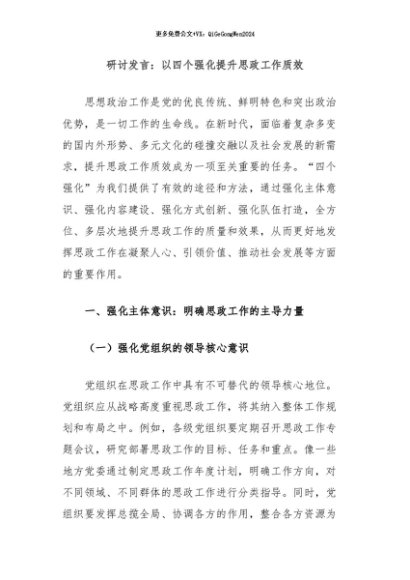 / 【七哥公文】2024年:研讨发言:以四个强化提升思政工作质效+更多免费公文+VX:QiGeGongWen2024
