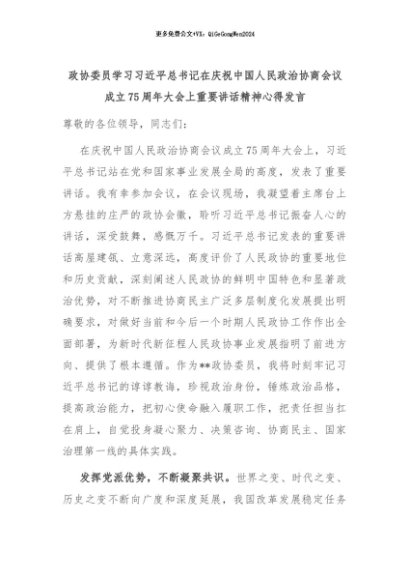 【七哥公文】2024年:政协委员学习习近平总书记在庆祝中国人民政治协商会议成立75周年大会上重要讲话精神心得发言+更多免费公文+VX:QiGeGongWen2024
