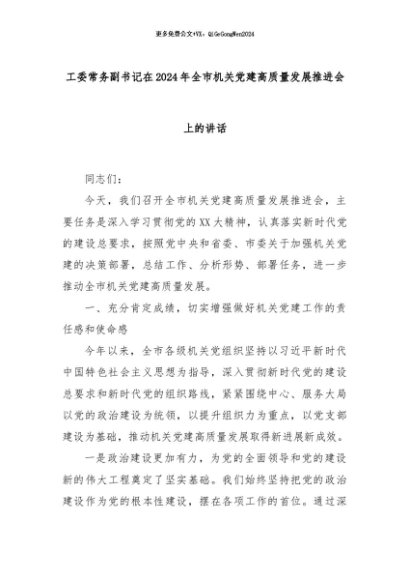 【七哥公文】2024年:工委常务副书记在2024年全市机关党建高质量发展推进会上的讲话+更多免费公文+VX:QiGeGongWen2024