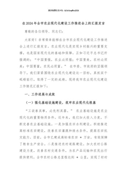 【七哥公文】2024年:在2024年全市农业现代化建设工作推进会上的汇报发言+更多免费公文+VX:QiGeGongWen2024