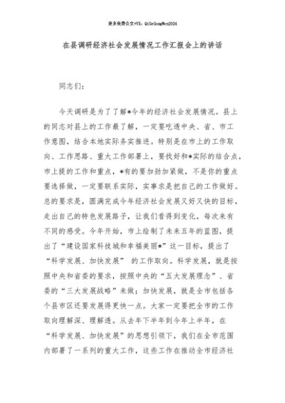 / 【七哥公文】2024年:在县调研经济社会发展情况工作汇报会上的讲话+更多免费公文+VX:QiGeGongWen2024