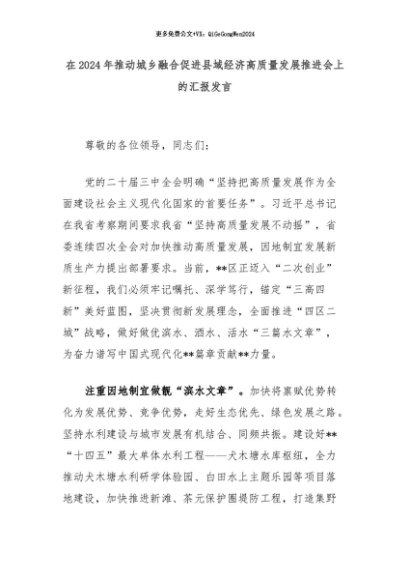 【七哥公文】2024年:在2024年推动城乡融合促进县域经济高质量发展推进会上的汇报发言+更多免费公文+VX:QiGeGongWen2024