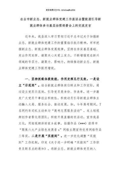 【七哥公文】2024年:在全市新业态、新就业群体党建工作座谈会暨鼓励引导新就业群体参与基层治理部署会上的交流发言+更多免费公文+VX:QiGeGongWen2024