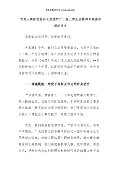 【七哥公文】2024年:市局人事劳资科科长在党的二十届三中全会精神专题读书班的发言+更多免费公文+VX:QiGeGongWen2024