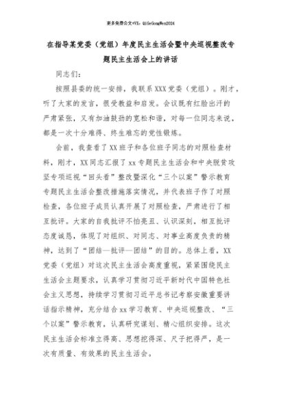【七哥公文】2024年:在指导某党委(党组)年度民主生活会暨中央巡视整改专题民主生活会上的讲话+更多免费公文+VX:QiGeGongWen2024